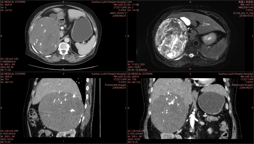 来自苏州吴中区甪直的马老太已过古稀之年,一年前发现自己腹部右侧微微隆起,但当时她觉得没有不舒服,也没当回事,更没有到医院做进一步检查。直到今年10月份,她感觉肚子隐隐作痛,还伴有腹胀、疲倦的感觉,便和家属到当地医院检查,发现果然有问题:右侧腹膜后巨大占位,大小约15cmx12cm。考虑肾上腺皮质腺癌。