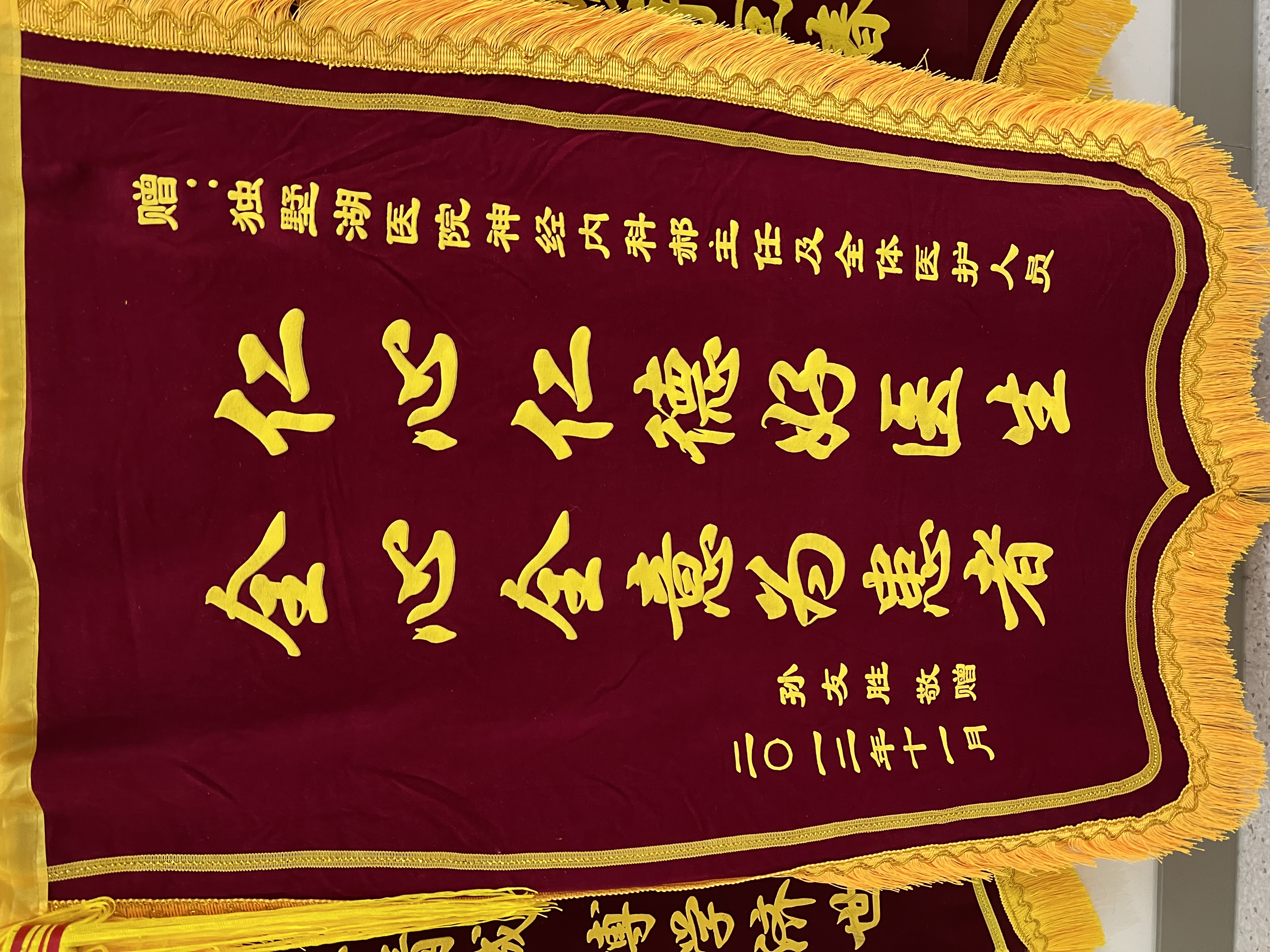 患者孙先生赠送锦旗感谢我院神经内科郝永岗副主任及全体医护