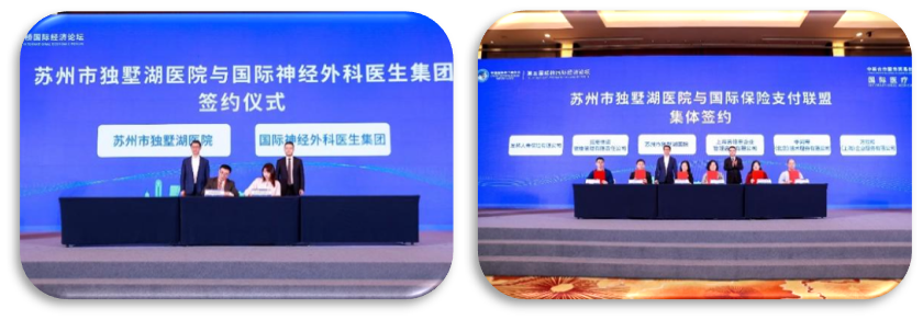签约仪式之一是苏州大学附属独墅湖医院与国际神经外科医生集团(INC)医疗服务合作协议签约仪式。侯建全院长与INC总助进行协议签署;苏州大学附属独墅湖医院作为国际神经外科医生集团在长三角地区的定点手术医院,为病患提供手术设备、麻醉团队及专业的术后护理。