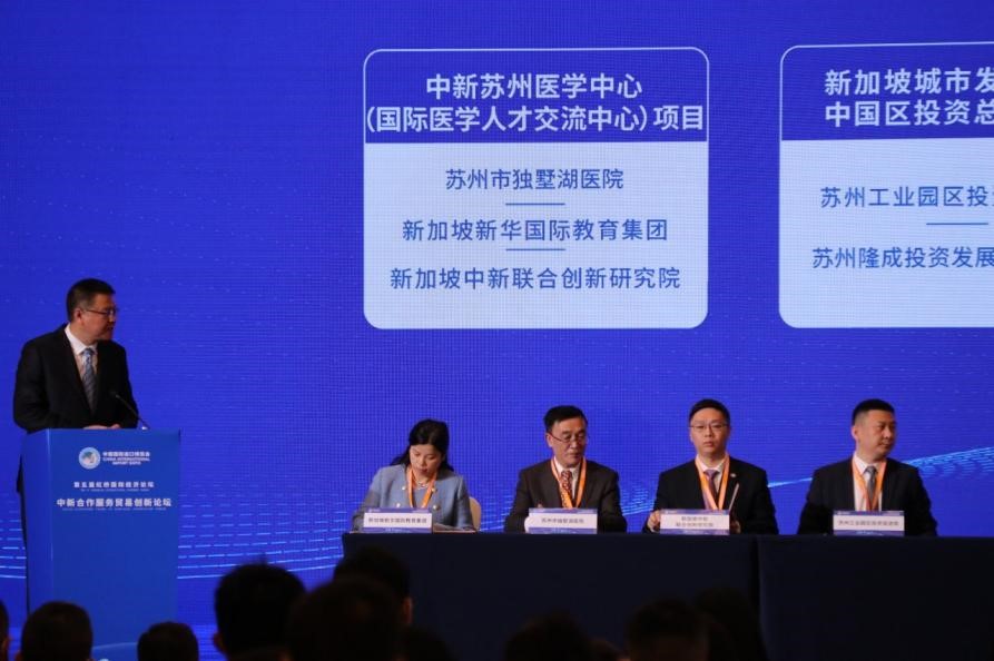 在6日上午的主会场,我院参与了主论坛环节之一的苏州工业园区重要合作项目的签约仪式。侯建全院长与新加坡新华国际教育集团、新加坡中新联合创新研究院相关负责人进行了中新(苏州)医学中心(国际医学人才交流中心)项目签约,进一步推动了中新(苏州)医学中心的建设步伐。