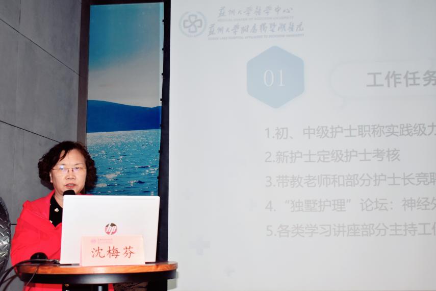 护理部王洁主任致辞,她表示,2022年护理部以医院五年战略为引领,践行“大卫生 大健康”理念,先试先行,深入贯彻落实“健康中国”国家战略,学科建设和疫情防控工作亮点突出。在苏州疫情防控紧张严峻的形势下,我院护理人员配合医院承担全市“黄码”人员诊疗护理工作。在上海疫情艰难时刻,各位勇担时代使命,派出的15人护理小队协助圆满完成援沪工作。本次会议希望各位护士长能总结过去,着眼未来,头脑风暴,找准独墅护理发展方向。