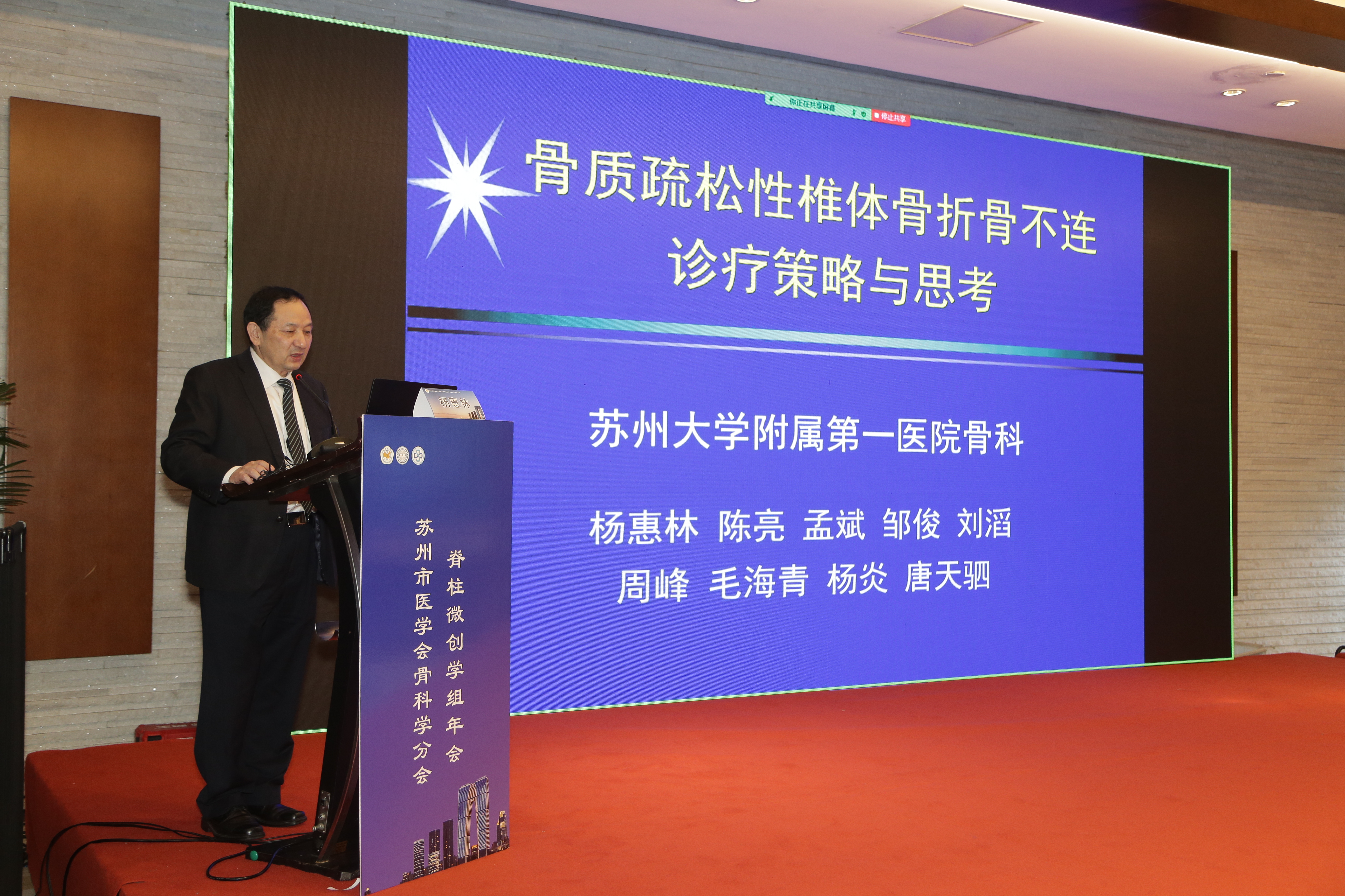 独墅湖医院党委书记、院长侯建全,苏州市医学会秘书长谭秋生,苏州市医学会骨科分会主任委员、苏州大学附属第一医院骨科主任杨惠林分别致辞。