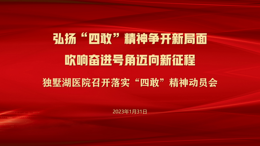 2023年1月31日下午,独墅湖医院召开落实“敢为、敢闯、敢干、敢首创”精神动员会,传达学习苏州市委、工业园区推进“四敢”精神动员会暨作风建设大会精神,吹响奋进实干的动员号角,激发全院职工干事创业的热情和创新实践的动力,全力推动“四敢”精神落地落实。医院党委书记侯建全主持会议并就深入学习贯彻领会苏州“四敢”动员会精神、推进医院工作高质量发展作了工作部署。