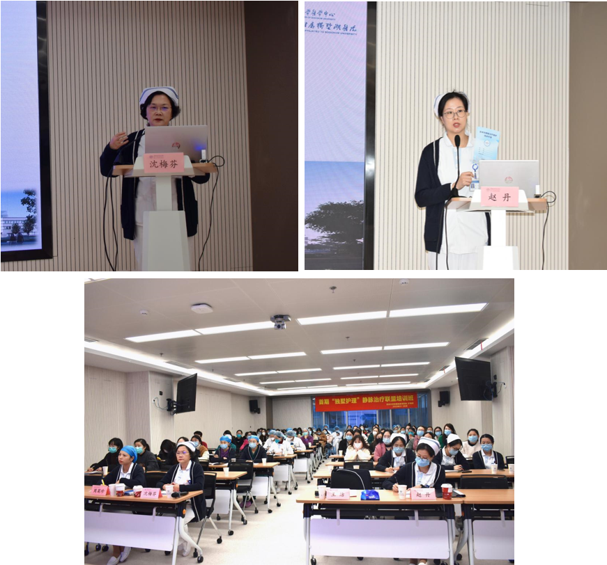 王洁主任、沈梅芬科护士长、赵丹科护士长、周菊珍专科护士分别进行了《临床静脉导管维护操作专家共识的解读》《静脉治疗护理质量评价标准及指标的建立》《血管通路器材及敷料的合理选择与正确使用》《静脉输液常见并发症及预防》的专题授课,为各位学员的临床实践工作做出了更加明确的指导。授课结束后,培训班现场进行了理论考试,了解学员们掌握授课内容的情况,后期针对薄弱环节进行侧重培训。