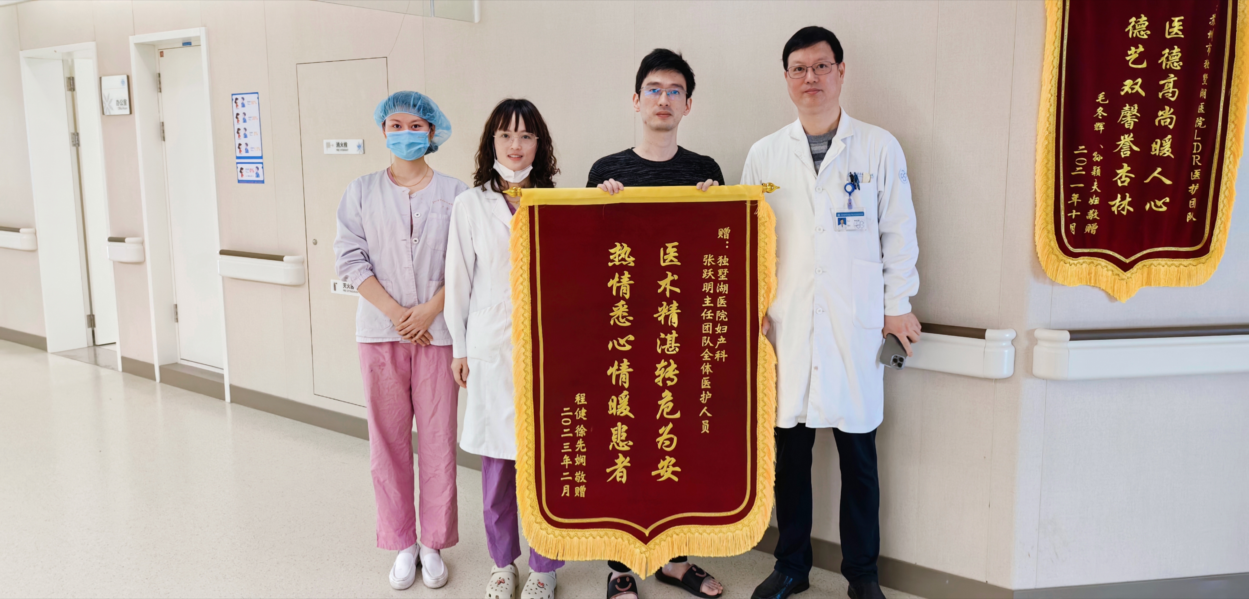 患者程先生、徐女士赠送锦旗感谢我院妇产科张跃明主任团队及全体医护
