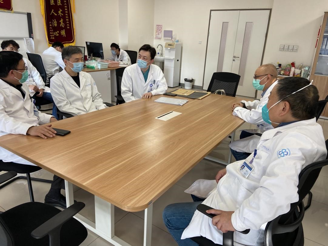(院党委书记侯建全教授、泌尿外科浦金贤教授与上海长海医院冯翔教授讨论患者病情)