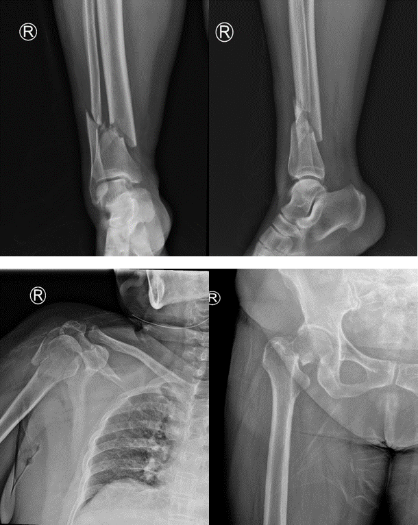 病情稍有稳定后,其它治疗迫在眉睫,如不能抓紧手术,严重的并发症将使患者再次陷入危险之中。骨科何罕亮副主任医师综合考虑患者情况,决定实施分期手术。第一次先行肱骨骨折切开复位内固定术 +胫腓骨骨折切开复位内固定术,第二次视患者情况择期行全髋关节置换术。第一次手术的关键在于速度要快!这一次手术一共需要处理两个部位、三处骨折,为了尽量减少对患者的影响,手术要求在短时间内完成。何罕亮医师团队术前仔细研究病情,术中精细操作,全部手术在3小时内顺利完成,手术中出血仅130ml,术后复查X线显示骨折对位对线良好。