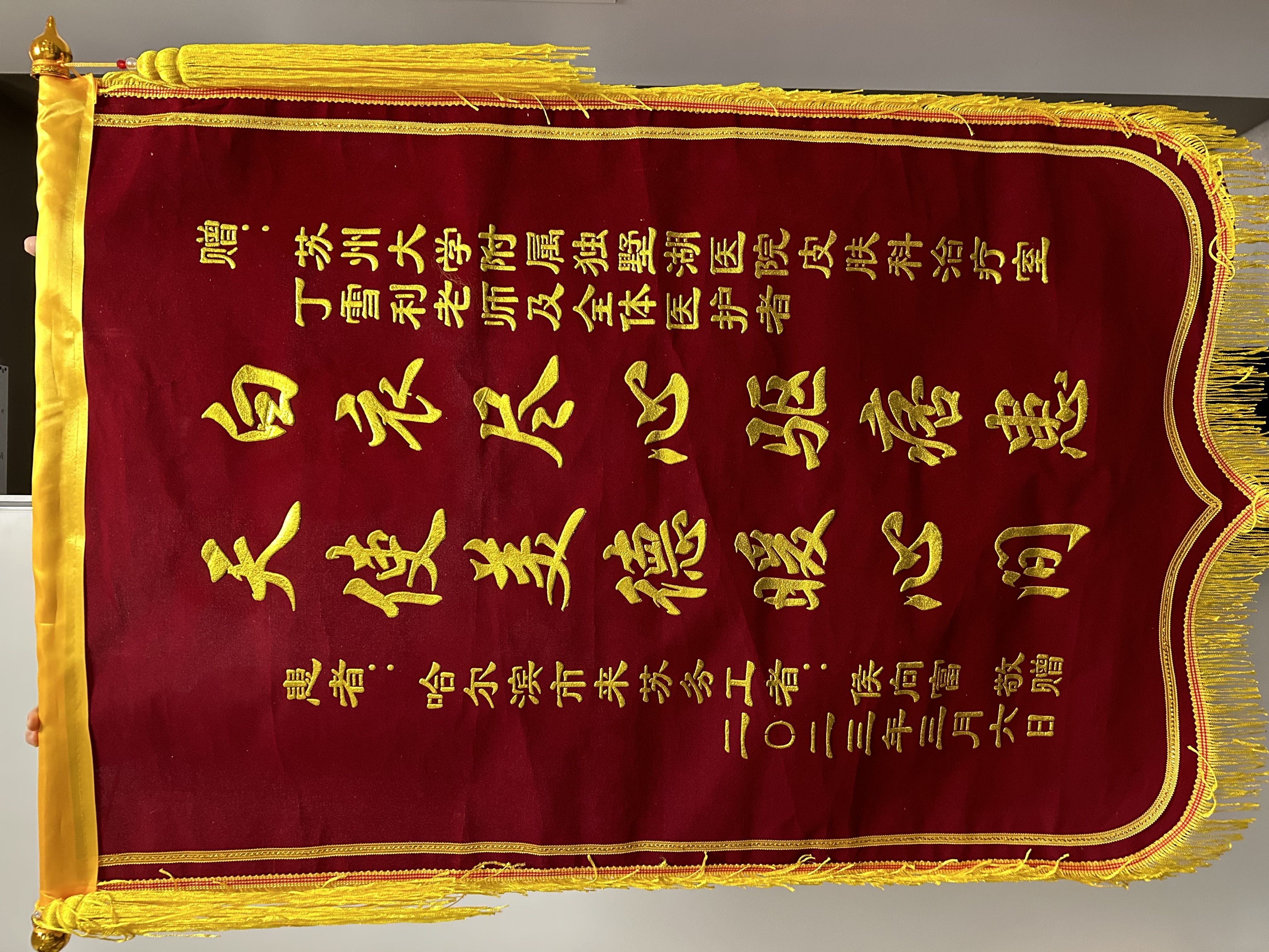 患者侯先生赠送锦旗感谢我院皮肤科治疗室丁雪利护士及全体医护