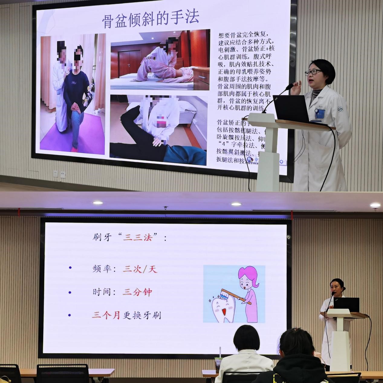 3月10日中午,医院康复科苏敏主任受邀从孕晚期乳房问题、产后恢复期常见问题、盆底功能障碍、腹直肌分离、骨盆倾斜、耻骨联合分离及腰背痛运动疗法等方面为女职工们科普了产后康复相关知识。除了产后恢复,口腔保健也是职工们日常生活中比较关注的问题。为此,口腔科姜涵副主任医师以“女性口腔健康”为主题,从妊娠前的口腔准备、牙周炎的危害及正确的刷牙方法等方面介绍了女性口腔预防保健知识。两位主任与在座的各位女职工们积极互动,答疑解惑。女职工们纷纷表示,两场讲座非常契合自身的健康需求,利用午休时间也系统学习了很多保健知识,收获颇丰。