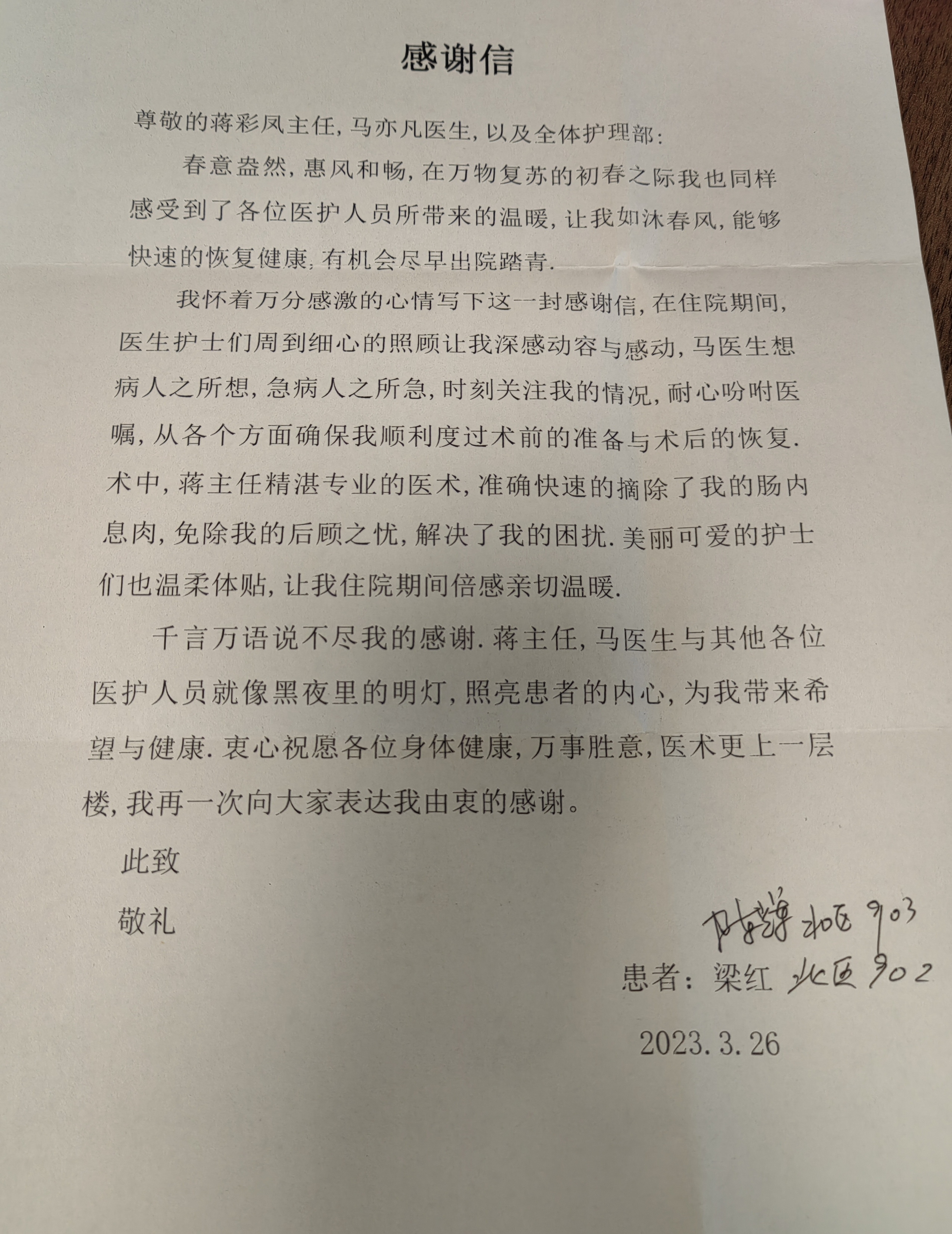 一封致我院蒋彩凤主任、马亦凡医生及全体护理的感谢信