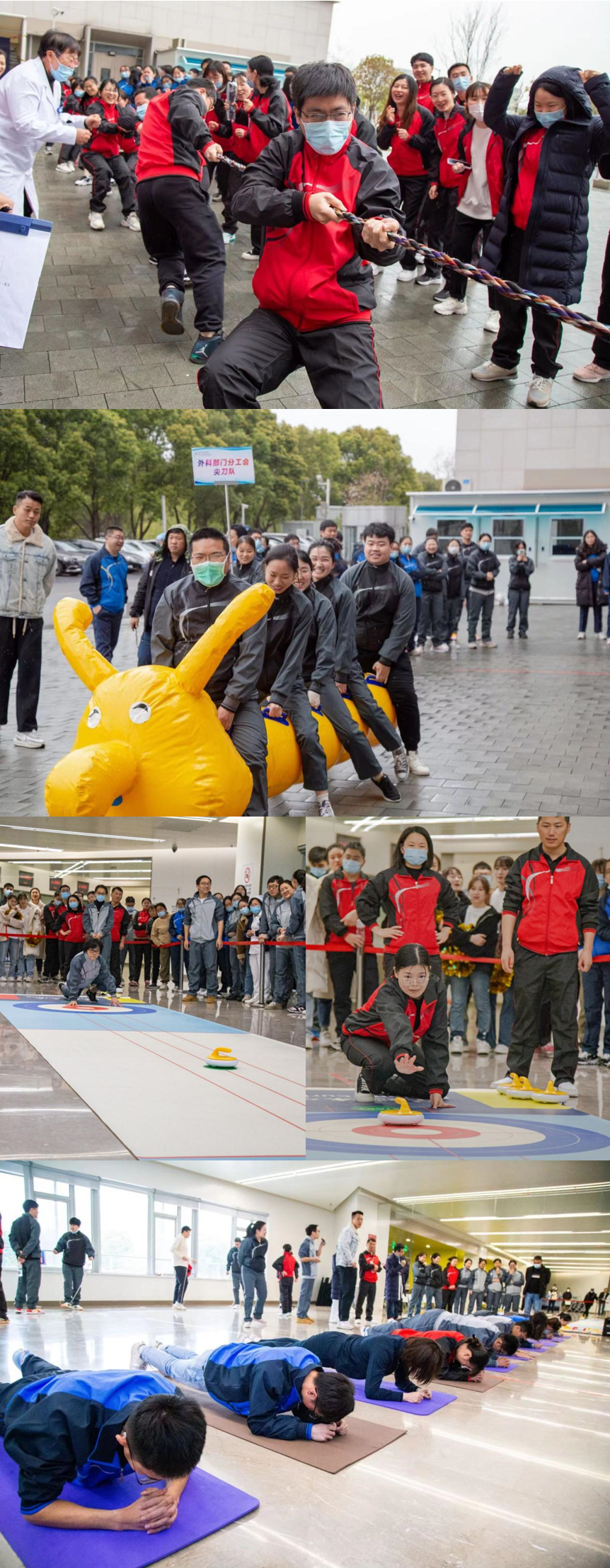 “加油、加油”……伴随着呐喊声和欢笑声,充满着激情和力量的拔河比赛拉开了趣味运动会的帷幕。经过抽签,第一轮是行政分工会和门急诊医技分工会,内科分工会和外科分工会比赛。伴随着裁判一声哨响,队员们个个火力全开,展开了的较量。最终门急诊医技部门分工会以绝对的实力战胜各路选手,获得了此次运动会拔河比赛的冠军。