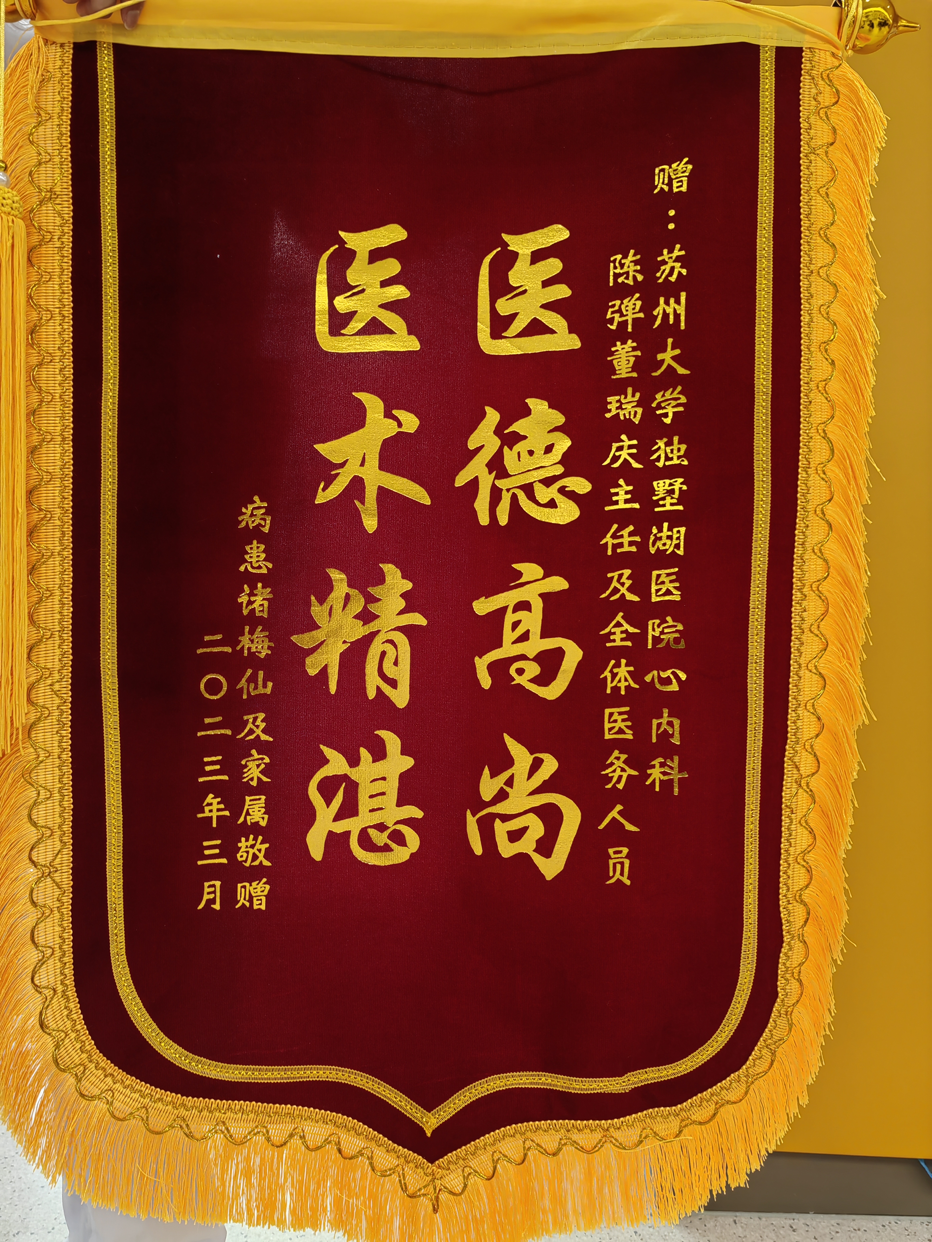 患者诸先生及家属赠送锦旗感谢我院心内科陈弹副主任、董瑞庆副主任医师及全体医护