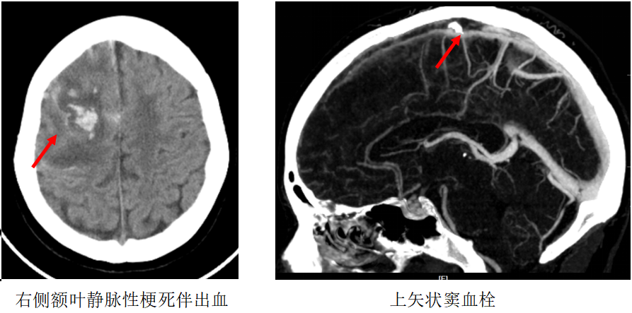 当时患者意识不清,反复癫痫发作伴恶心呕吐,左侧肢体不能抬离床面。经检查,患者右侧额叶脑出血,蛛网膜下腔出血,上矢状窦内钙化伴血栓形成。诊断为颅内静脉窦血栓形成和继发性癫痫。急诊予以控制癫痫发作、脱水降颅压治疗。