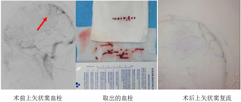 患者颅内出血,系颅内静脉系统回流不畅所致,出血量随时可能继续增多,病情危重,随时可能发生脑疝,危及生命,需及时清除颅内静脉窦血栓。我院神经内科郝永岗主任充分与患者家属沟通病情后,决定带领神经内科介入团队立即行急诊脑血管造影+经皮颅内静脉窦取栓术。考虑取栓术后存在颅内高灌注导致出血增多风险,需紧急行颅内血肿清除术可能,故同时联系神经外科及重症医学科联合诊治。后于急诊全麻下行脑血管造影+经皮颅内静脉取栓术,术中取出大量黑红色血栓,术后复查脑血管造影见上矢状窦主干血流恢复。