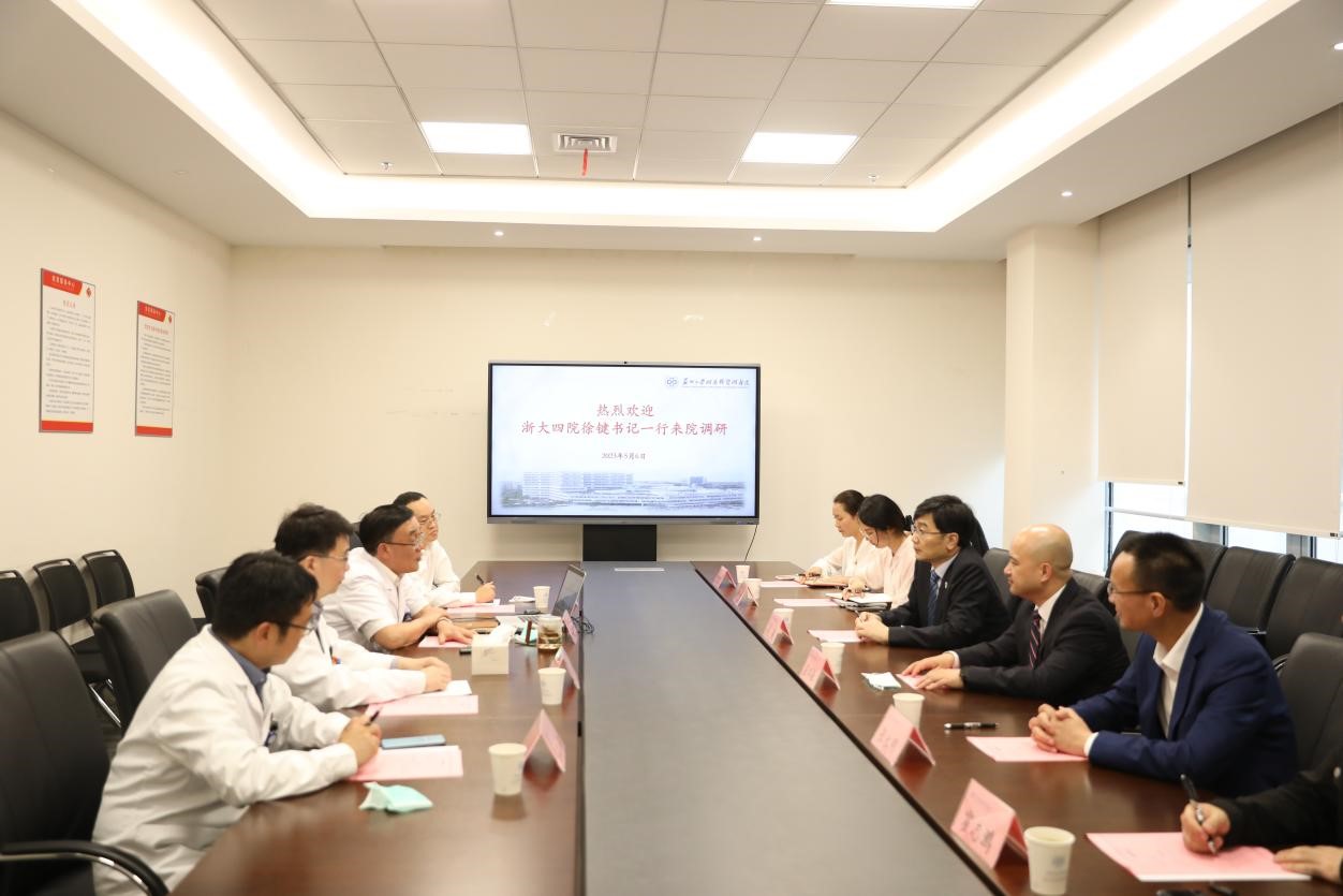 5月6日下午,浙江大学医学院附属第四医院和“一带一路”国际医学院(筹)党委书记徐键一行来我院参观调研,交流了医院建设的优秀经验和管理模式,旨在加强医院之间的交流合作,共谋医疗发展大计。浙大“一带一路”国际医学院(筹)副院长兼浙大四院副院长应颂敏、浙大四院综合部主任陈星、科研部主任张永明、发展联络办主任陈奕颖及综合部霍志鹏参加调研。独墅湖医院党委书记侯建全,党委委员、副院长郭强,党政办公室主任傅强及科教处处长江淼陪同调研。