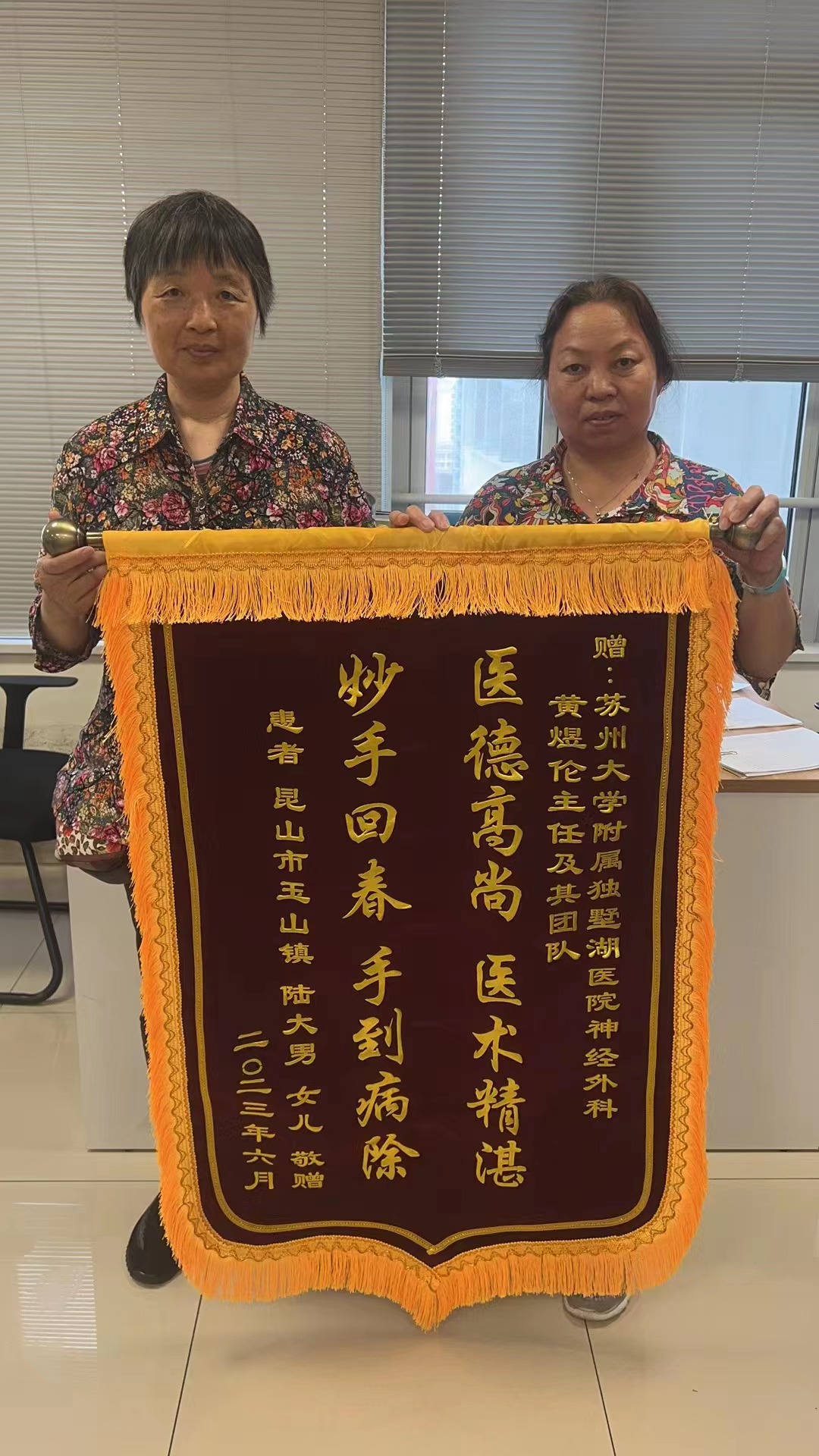 患者陆先生及家属赠送锦旗感谢我院神经外科黄煜伦主任及其团队