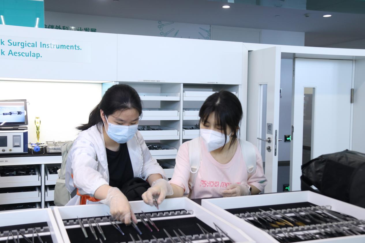 74日附属独墅湖医院科教处带领实习生前往蛇牌学院开展培训,在培训过程中,蛇牌学院培训中心负责人沈晞首先带领同学们参观并介绍了学院特色、学科开展情况和外科医学发展与未来,并带领同学们参观讲解了外科手术中的各种新型医疗器械的名称和使用方法,同学们认真听讲、积极实践,学习了不少外科学知识和技能操作要点。