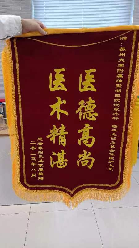 患者朱先生及其家属赠送锦旗感谢我院泌尿外科陆兵副主任医师及全体医护
