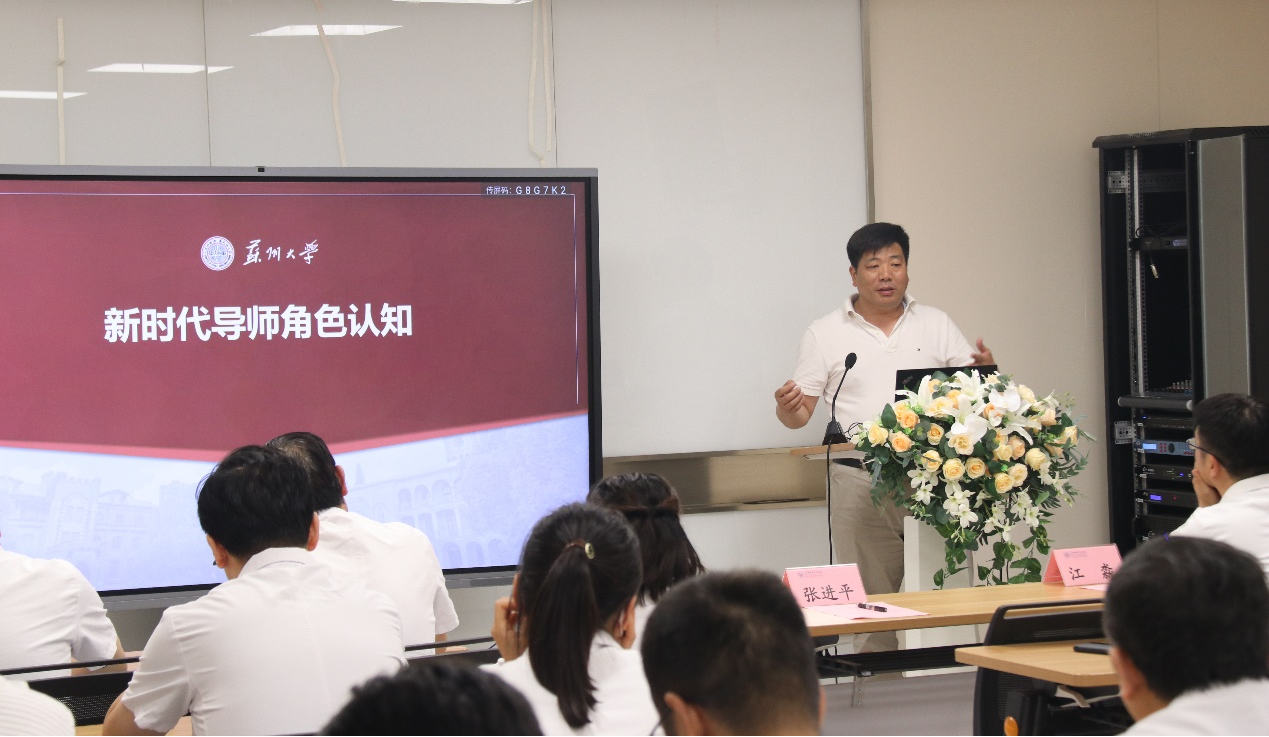 随后,张进平院长以《新时代导师角色认知》为主题进行了倾情分享。张院长从当前中国特色社会主义新时代下的研究生教育现状、导师队伍现状、科学研究现状等角度出发,进行深入剖析。他指出,新时代对于导师队伍建设有新要求,研究生教育作为国家重要战略支撑,要做到注重人才的选拔、培养方案的制定以及环节培养。导师作为第一责任人,要以立德树人作为使命,坚持德育为先、以人为本,明确导师在研究生培养中的关键作用,以父母之心育人,以学生为中心教学。