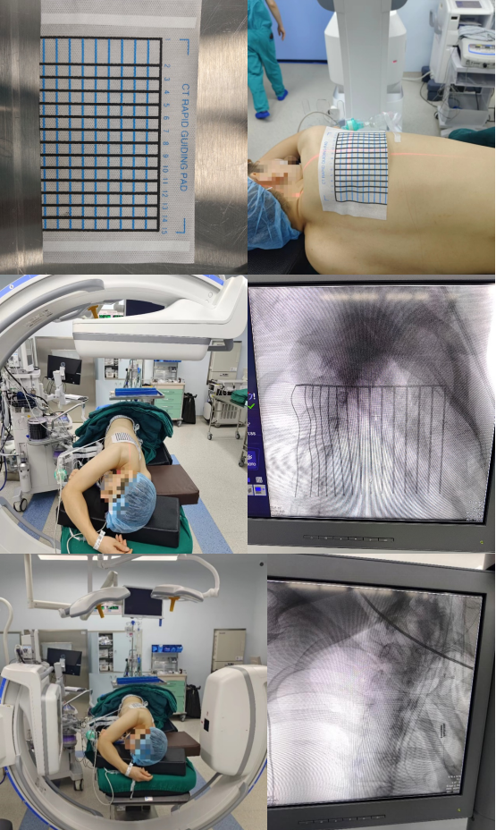 手术当天中午,患者进入手术室,进行常规气管插管全身麻醉。在进入麻醉状态后,患者取右侧卧位,在右上肺病灶的后背投影处粘贴CT快速引导垫。