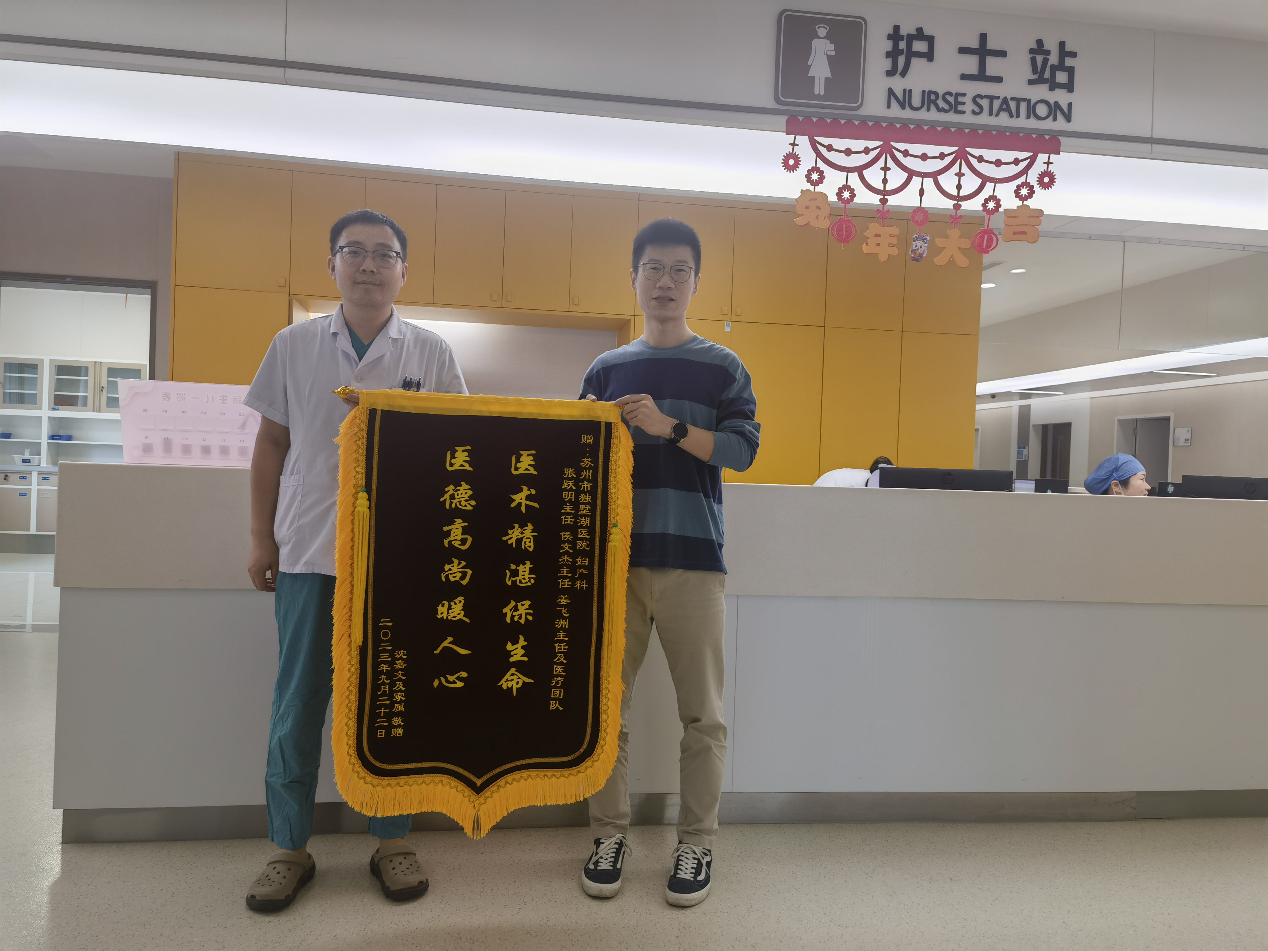 患者沈女士赠送锦旗感谢我院妇产科张跃明主任、侯文杰副主任、姜飞洲副主任医师