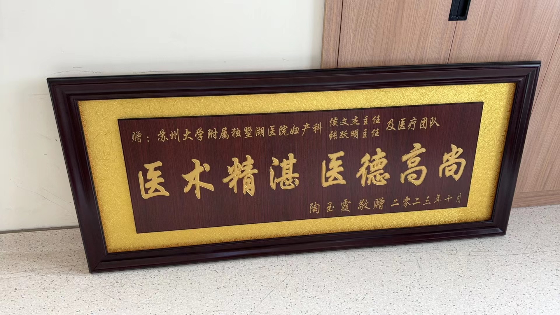 患者陶女士赠送匾额感谢我院妇产科张跃明主任、侯文杰副主任及全体医护