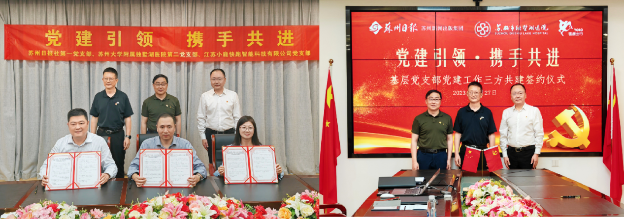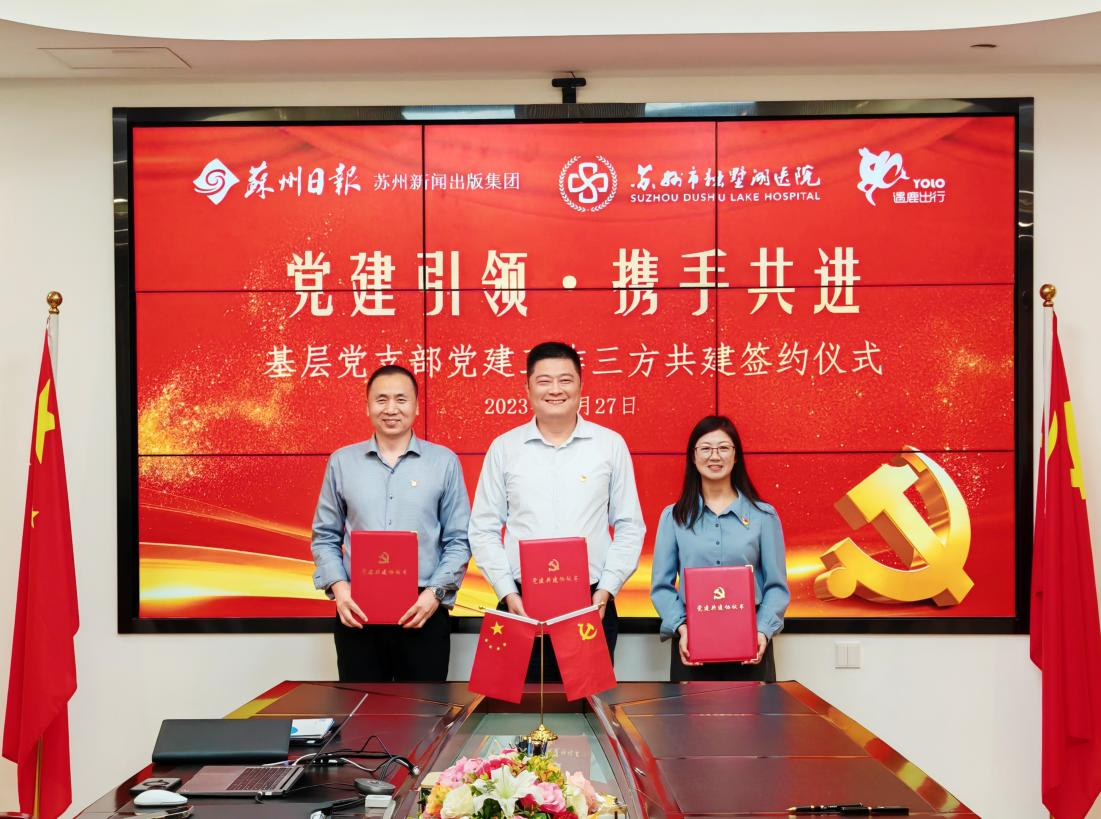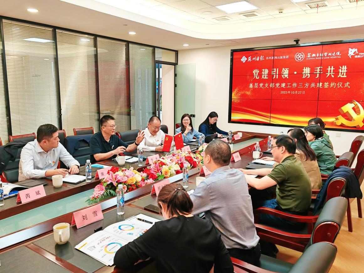 随后我院第二党支部书记郝永岗、苏州日报社第一党支部书记黄亮进行三方共建签约。此次活动有效推动党的组织建设工作的开展,提升党支部的组织力和凝聚力。
