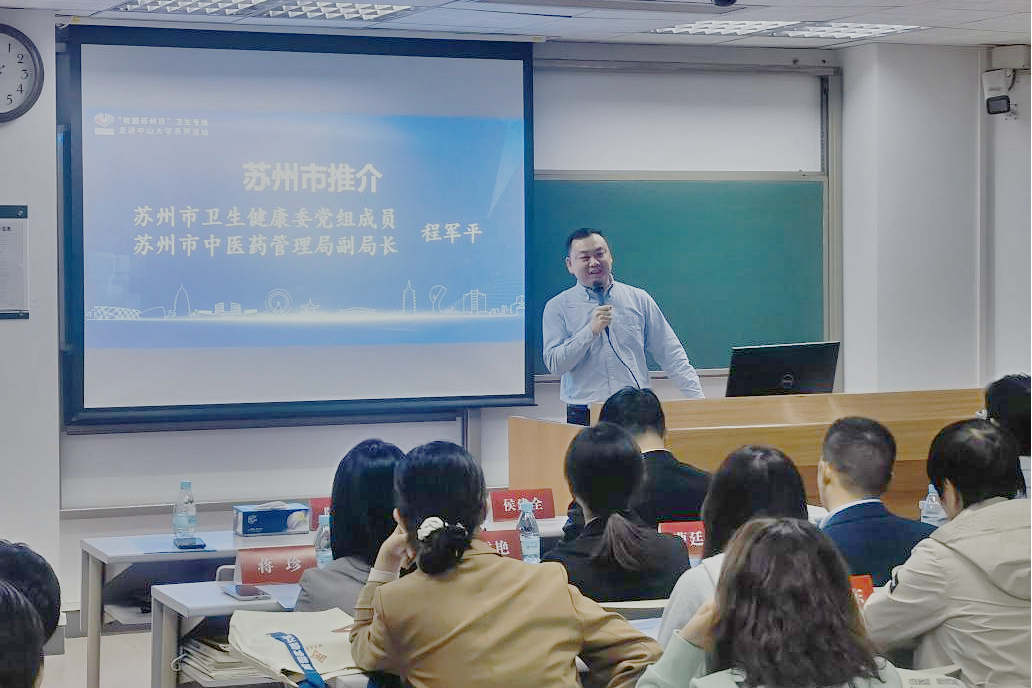苏州市卫生健康委党组成员、苏州市中医药管理局副局长程军平在推介会上,作苏州市卫生人才发展环境推介。他开篇引三首诗勾勒了一个粉墙黛瓦、小桥流水、物产丰富、历史悠久的苏州。他指出,苏州不仅拥有美誉天下的园林,同时也拥有着强大的医疗资源。生物医药产业作为苏州的“一号产业”,基础坚实,奠定医疗卫生资源的硬实力不断提升。苏州一流资源体系完备、一流平台顶层赋能、一流院校合作增效,正全力打造健康中国典范城市,热切期盼中大学子可以来到苏州、建设苏州、扎根苏州。