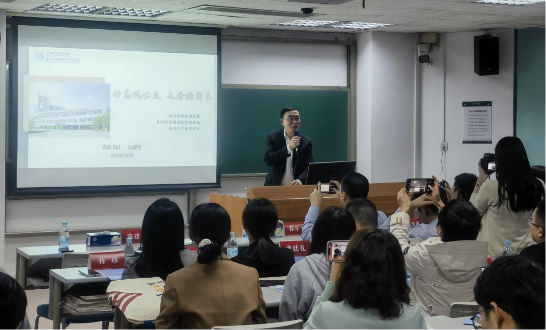 11月16日下午,由苏州市卫生健康委主办,苏州市独墅湖医院(苏州大学附属独墅湖医院)承办,2023年秋季“校园苏州日”卫生专线系列活动走进中山大学中山医学院。中山医学院党委副书记陈保瑜,苏州市卫生健康委党组成员、苏州市中医药管理局副局长程军平,苏州工业园区卫生健康委员会主任冯彬,独墅湖医院党委书记侯建全出席苏州市卫生人才发展环境推介会,会议由苏州工业园区卫健委陈建忠副主任主持。