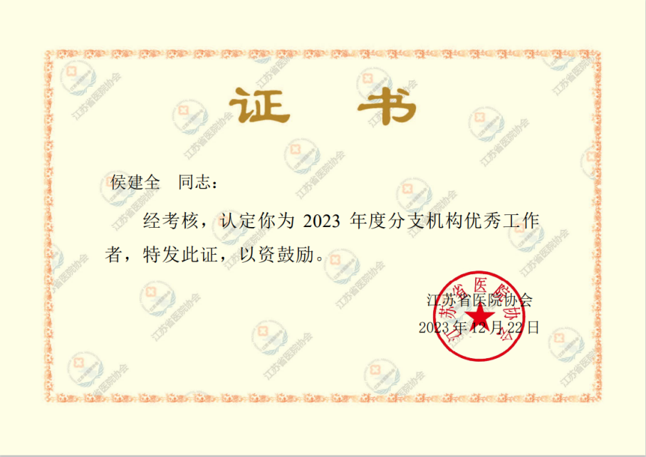 为进一步激励各分支机构积极性,根据《江苏省医院协会关于开展2023年度分支机构年度考核工作的通知》要求,结合分支机构2023年度在学术交流、承接职能、调查研究、行风建设等方面的表现,凭借在分支机构中的突出贡献,侯建全同志被评为江苏省医院协会2023年度医院管理评价研究专业委员会优秀工作者。