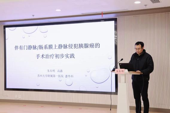 学习班下午议程主持嘉宾由本次大会主席、苏州大学附属独墅湖医院普外科张逸副主任担任。苏州大学附属第一医院朱东明副教授首先带来了“伴有门静脉/肠系膜上静脉侵犯胰腺癌的手术治疗初步实践”讲座,并通过手术视频的形式展示了精湛的手术技术,更直观地讲解了人工血管重建的手术策略。