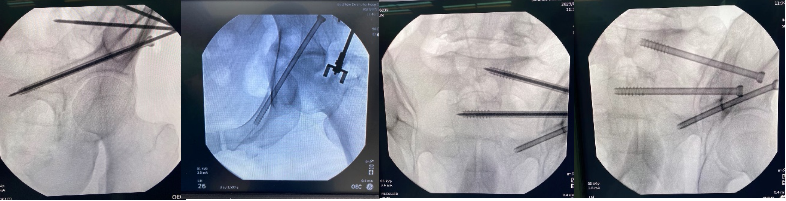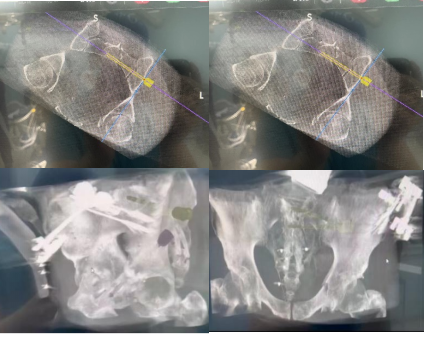 手术当天,骨科治疗组组长何罕亮副主任医师带领团队采用先进的二代臂机对患者进行骨盆图像采集,并将影像学资料上传至机器人计算机中。经过机器人的精密运算,患者的骨折三维图像非常直观地呈现在医生面前。随后,何主任团队根据图像实时进行手术规划,选择最佳置钉通道。手术机器人机械臂根据制定好的路线精准定位,将误差控制在1mm之内,使得医生不必扩大切口即可暴露骨折断端。只需3个毫米级切口,螺钉便可精准打入狭长的耻骨中,避免损伤重要的血管、神经组织。通道确定后,整个置钉过程短短几分钟便完成了,手术出血量不足10ml。精准的置钉操作使得医生不必担心反复调整所致的钉道松动,术后透视也进一步确认了螺钉位置准确无误,这预示着手术圆满成功。