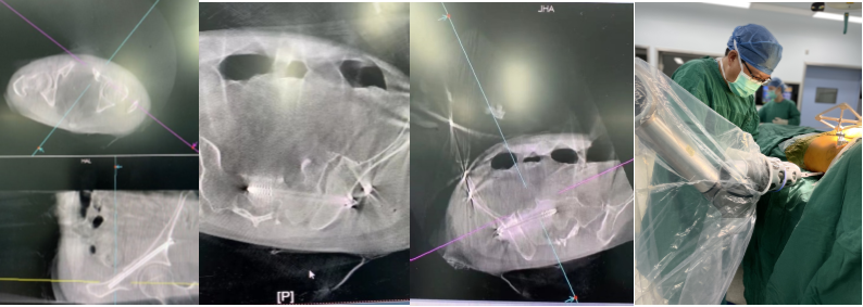刘先生工作时不慎从高处坠落,致左髋部疼痛,无法活动,遂前往当地医院就诊,诊断为“左侧耻骨上下支骨折”。家人为求进一步诊治,联系了我院骨科主任姜为民教授,转至我院骨科就诊。姜主任经过仔细检查,发现患者并非简单耻骨骨折,而是左侧髋臼骨折合并同侧分离移位的DennisⅡ型骶骨骨折,属于复杂TypeC1.3型骨盆骨折,需要手术治疗。骨盆髋臼骨折的手术治疗,在传统创伤骨科中属于难度最高的一类手术。骨盆解剖结构复杂、位置深,一旦发生骨折,往往需要手术医生切很长的切口去显露骨折断端。其次,在骨折复位、放置内固定的过程中,可能会伴随出血多、创伤大、手术时间长等问题。多种莫测的因素混杂,极易造成患者术后恢复时间延长、切口感染率上升、后遗疼痛难以缓解等术后问题。姜主任经过细致的分析,敏锐地发现刘先生的骨折,非常适合使用我院最新引进的国产二代机器人进行微创手术,从而规避骨盆骨折手术过程中可能存在的风险。