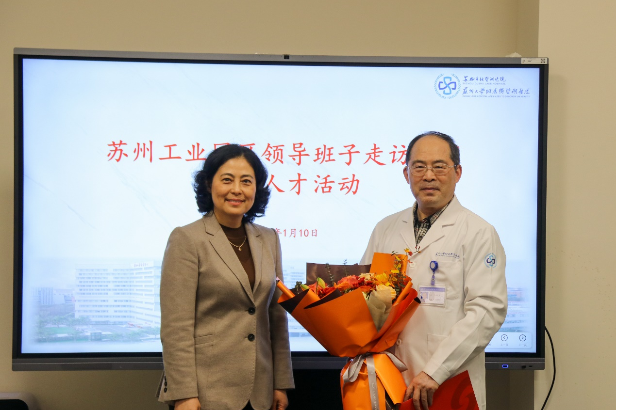 最后,姚文蕾书记向张学军教授送上慰问鲜花与新春祝福。她表示,医院高质量的发展离不开高质量的人才,随着中新苏州医学中心的建立,园区管委会将一如既往的助力独墅湖医院为学科专家搭建平台,汇聚更丰富更优质的资源,力争将独墅湖医院办成研究型、国际化、高水平的一流医院。