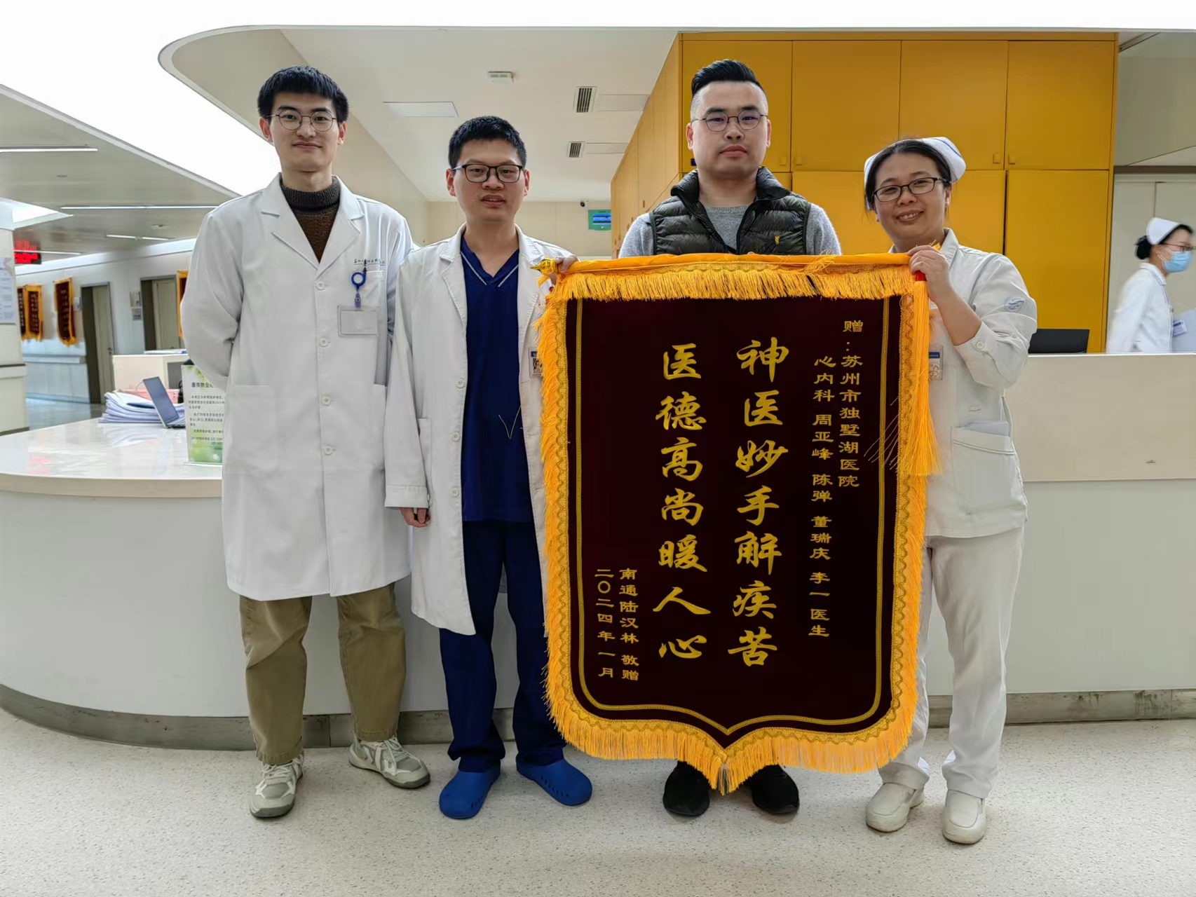 患者陆先生赠送锦旗感谢我院心内科周亚峰副院长、陈弹副主任、董瑞庆副主任医师及李一医生