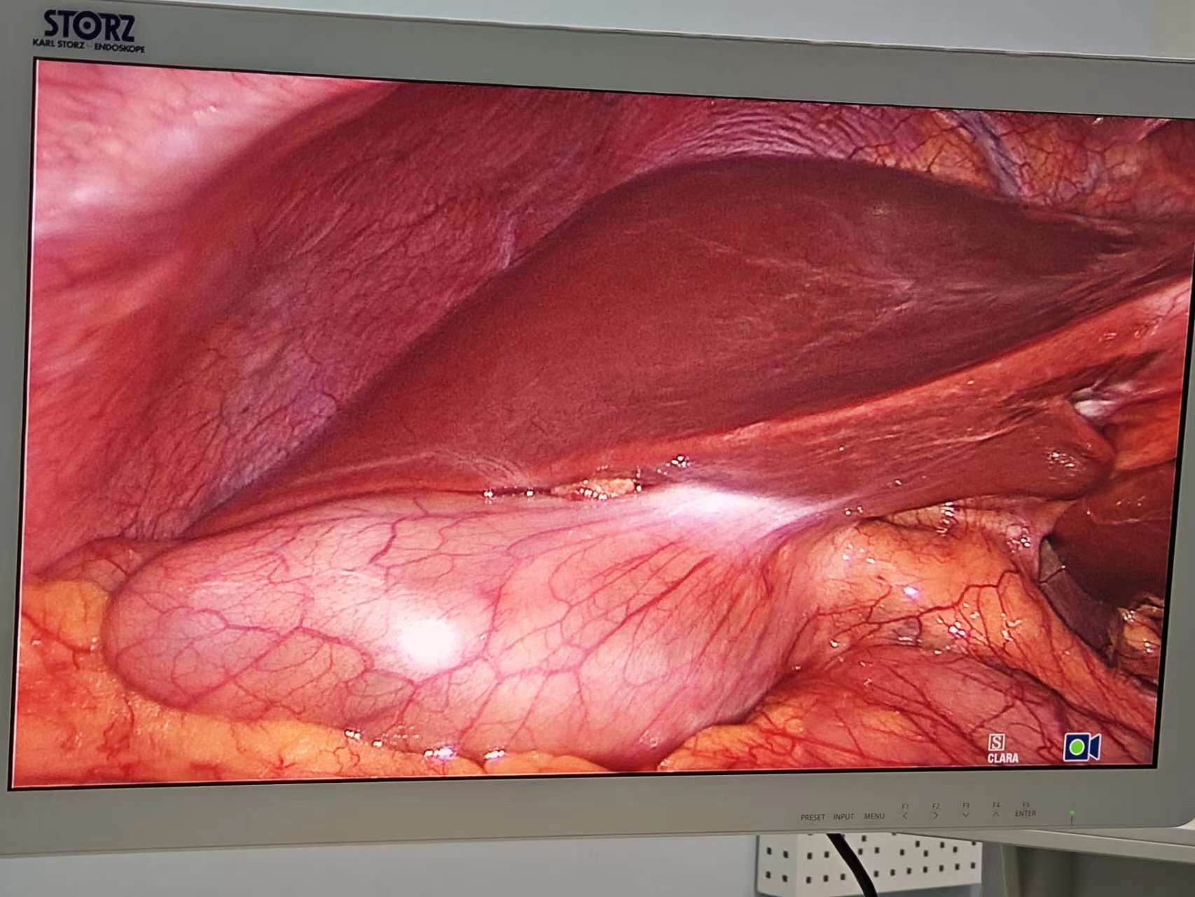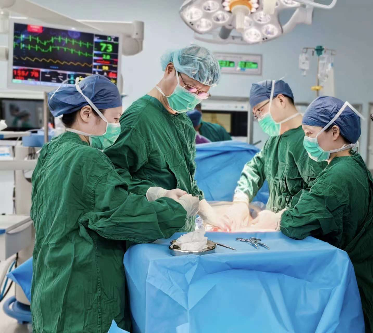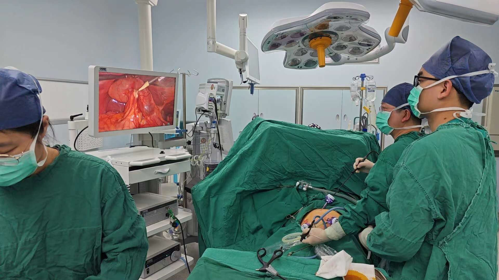 考虑到孕晚期的因素,微创手术难度更大,于是术前再次给小敏复查了胆囊B超,评估胆囊张力、探查胆管。第一阶段的剖宫产手术由妇产科张跃明主任主刀,姜飞洲副主任医师协助,在高超的技巧及精确、迅速的手法下,手术半小时完成,前鞘层、皮下脂肪层加固缝合,为第二阶段手术打下牢固基础。第二阶段手术由普外科杨泽利副主任医师主刀,行低气腹压下腹腔镜胆囊切除术。术中谨慎操作、减少出血,减轻对子宫的刺激,肿大的胆囊迅速被切除并送病理检查。整个手术过程中,由麻醉科李健主任团队实施精准麻醉,为母婴安全保驾护航;妇产科、普外科默契配合,整场手术衔接有条不紊,保障了孕妈妈和胎儿的安全。