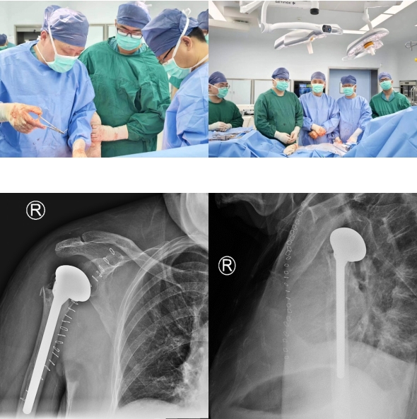 患者办理住院后,如何选择治疗方案成了一个关键问题。鉴于常规的骨折复位内固定难以取得预期疗效,只能另辟蹊径。申阿姨的情况特殊之处在于:1.年龄较大,骨质疏松严重,内固定系统固定效果欠佳,容易松动失败。2.肱骨头完全脱位且只有薄薄一层,完全没有血供,即使勉强固定,骨折也难以愈合,后期肱骨头坏死的可能性几乎不可避免。面对这样棘手的情况,骨科姜为民主任、林俊主任、杨小海主任以及其他专家群策群力,共同研究后一致认为,人工肩关节置换手术对于申阿姨来说是较为理想的选择。该术式可以有效避免上述的多个问题,术后早期患者还可进行关节功能锻炼,能明显改善其生活质量。手术方案制定后,经过缜密的术前准备,手术如期进行。整个手术过程仅持续了2个小时,杨小海主任团队顺利完成了我院骨科第一台肩关节置换手术,填补了苏大附四院骨科该术式开展的空缺。术后患者复查X片提示肩关节假体位置满意,手术获得成功。在佩戴支具固定1-2周后,申阿姨便可开始患肩的功能锻炼,申阿姨及其家人对此次治疗就医经过表示满意。