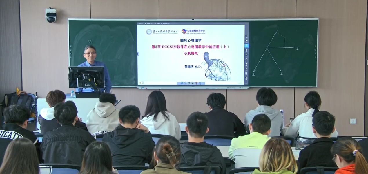 在课堂上,董瑞庆老师深入浅出地讲解了心电图理论知识,并结合ECGSIM仿真软件进行现场演示。通过模拟心电图,同学们更加直观清晰地了解认识数据中所展现的形态学和心电异常,进而加深对理论知识的理解。董老师还在授课中使用智能课堂软件进行签到及答题,提高了授课效率、丰富了授课形式,学生们纷纷表示此次课程收获颇丰。