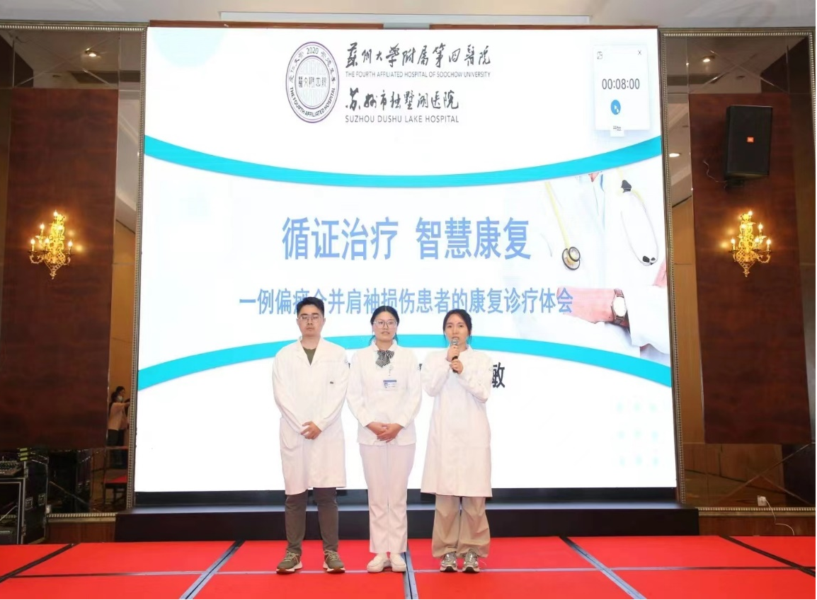 由我院张娟、骆振周、凡晓敏三人组成的团队以《循证治疗·智慧康复——一例偏瘫合并肩袖损伤患者的康复诊疗体会》为题,阐述了康复目标与计划的制定过程。分别从“医治护”三方角度,以“诊康护”为要点,分享了在肌肉骨骼因素所导致的偏瘫肩痛康复治疗方面的诊疗难点与特色精准技术,收获评委的一致好评。