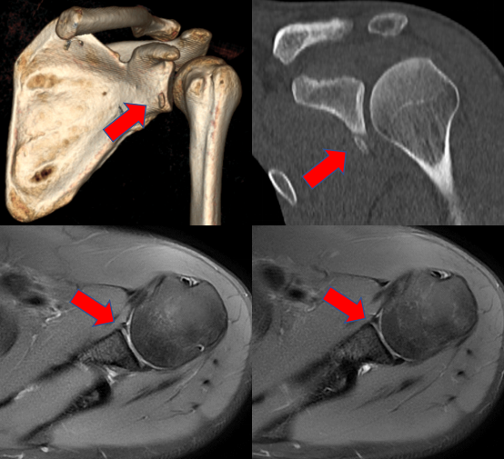 影像学提示患者肩关节盂唇损伤,可见明显的骨片影,盂唇与关节盂分离
