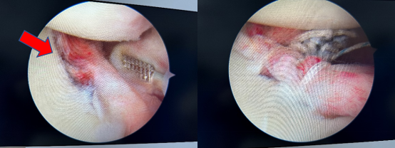 术中镜下图片:损伤撕裂的盂唇清晰可见,术后(右)已成功修补