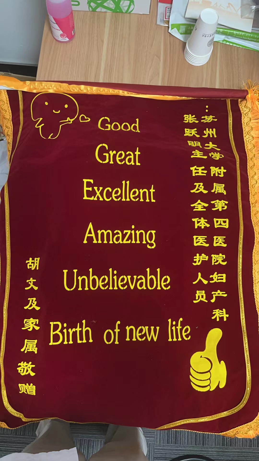 患者胡女士及家属赠送锦旗感谢我院妇产科张跃明主任及全体医护人员