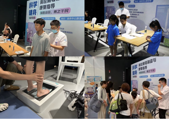 全民健身日当天,苏州大学附属第四医院运动促进健康中心联合苏州奥体中心,以“体医结合,惠之于民”为主题,在苏州奥体中心游泳馆开展了苏州市科学健身指导周之脊柱侧弯筛查与康复指导。为近百名青少年进行脊柱侧弯及足底功能筛查,根据筛查报告对青少年及其家属进行科学的姿势管理及运动指导。为附近居民、运动爱好者等提供免费运动预防及姿态评估、发放健康资料和运动处方,提升健康服务效率,最终促进园区全民健康水平提升。