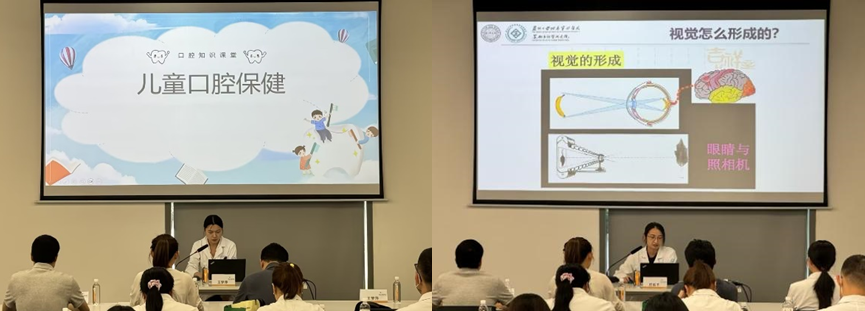 苏大附四院口腔科王梦萍医师和眼科庄歆予医师化身健康科普讲师,为到场企业青年职工家长和孩子们带来了生动有趣的牙齿与眼科防护知识普及课程。通过案例分析、模拟演示等形式,让孩子们在轻松愉快的氛围中学习到了如何正确刷牙、保护视力等关键知识,以帮助青少年儿童养成健康行为习惯。