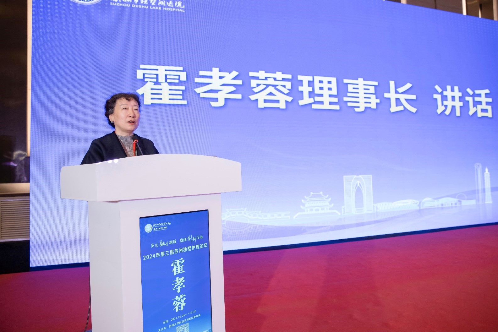 10月24至26日,苏州大学附属第四医院护理部举办了2024年第三届苏州独墅护理论坛。江苏省护理学会理事长霍孝蓉,苏州工业园区卫健委主任冯彬,苏州市卫健委医政医管处处长王菊花,苏州大学附属第四医院党委书记侯建全,苏州大学附属第四医院院长方琪等出席会议。本次护理论坛以多种形式呈现新质生产力下的护理新理论、新方法及新成果,旨在聚焦热点前沿,解决临床护理疑点、难点。本届会议内容覆盖面广、应用性强,吸引了省内外300余名护理骨干齐聚一堂。开幕式由苏大附四院方琪院长主持。