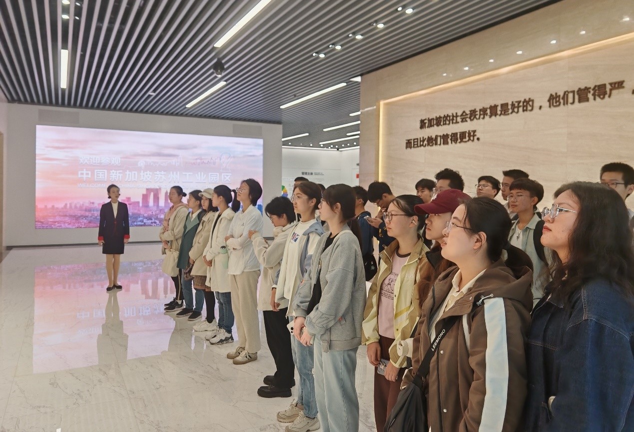 活动开始于上午10时,苏州工业园区档案大厦展示中心。在讲解员的引领下,同学们首先参观了展示中心一层,详细了解苏州工业园区的开发建设历程——从1994年中新合作苏州工业园区启动建设开始,到如今已经成为一个现代化、国际化的城市新区,园区经历了从无到有、从小到大的发展历程。展区分为多个版块,中新合作、发展历程、改革开放试验田等,全面展示了园区的建设背景和成就。同学们深刻领略园区在改革开放和现代化建设中所取得的巨大成就;感受到工业园区人在这一过程中所付出的辛勤努力和汗水;全面了解到苏州工业园区践行新发展理念、推动高质量发展的辉煌成就,特别是为“强富美高”新江苏所呈现的开放创新综合试验方面“园区样本”以及其中的突出贡献。