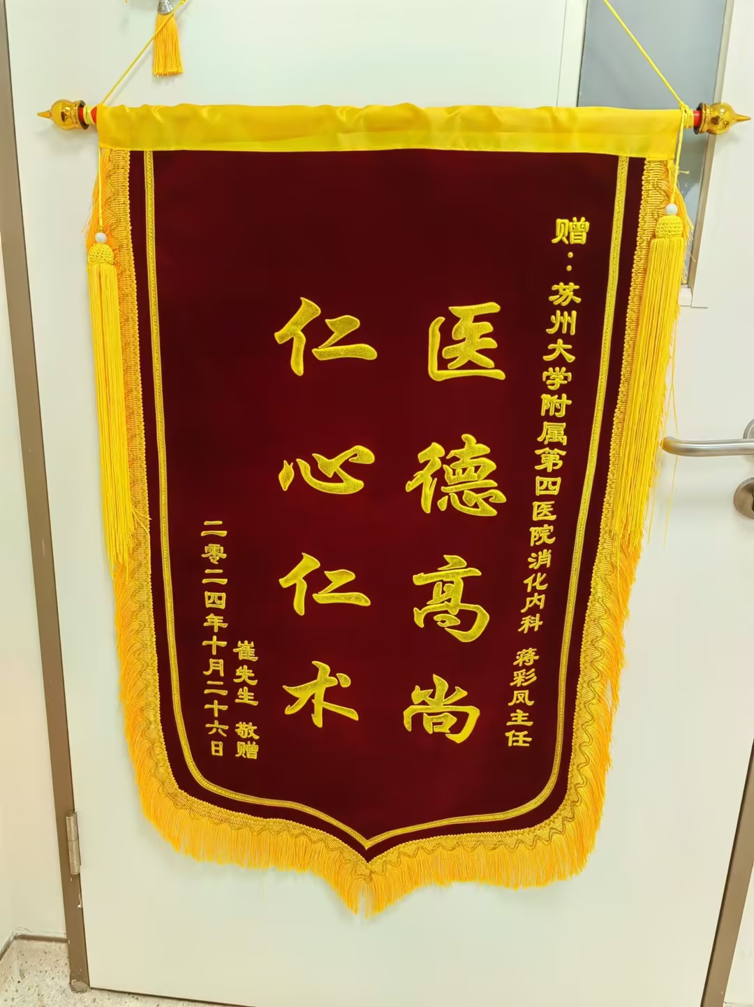 患者家属崔先生赠送锦旗感谢我院消化内科蒋彩凤主任