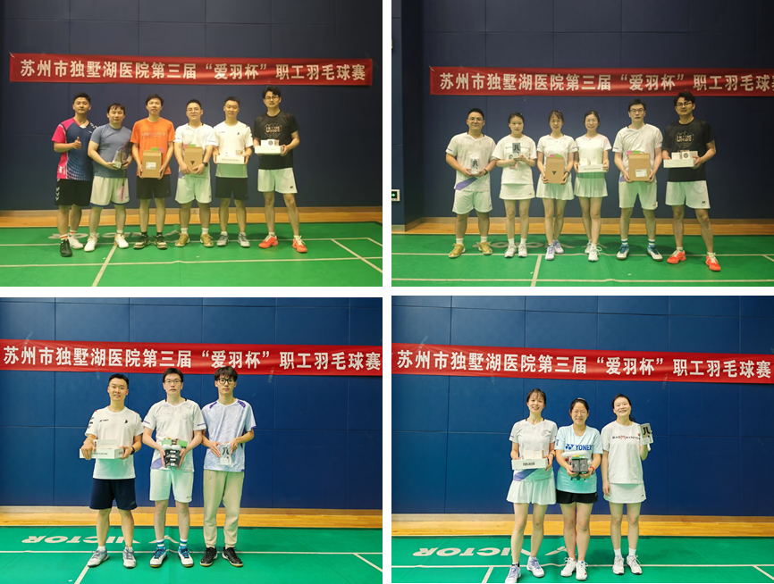 经过激烈的角逐,最终决出了名次,4个小时、36场比赛,苏大附四院第三届“爱羽杯”职工羽毛球赛圆满落幕。女子单打前三名分别为莫佳语、何雅欣、秦琪;男子单打前三名分别为陈军、徐旭、尤金秋;混合双打前三名分别为陈军/秦琪、王珺琰/何雅欣、洪华东/岳子彦;男子双打前三名分别为王珺琰/钱俊、梁容瑞/谢凯、洪华东/尤金秋。赛后为获奖选手颁发奖品,并且每一位参赛选手也获得了精美纪念品。