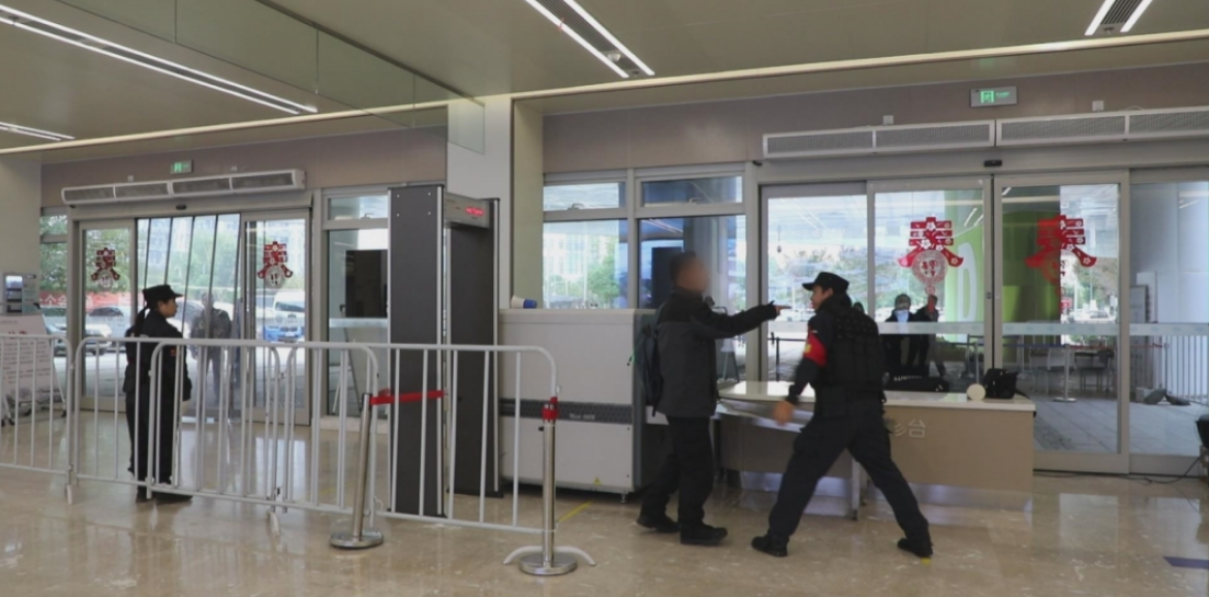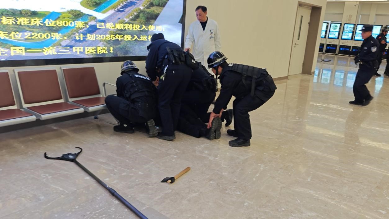 本次演练共有两个场景,场景一为门诊安检处的突发砍人事件。事件发生缘由:两名男子在门诊安检处拒不配合工作,先辱骂推搡安保人员,随后其中一人拔出随身刀具对现场人群无差别追砍。我院职能部门,急救团队及安保人员,配合辖区驻院警方快速应对,处置并善后。