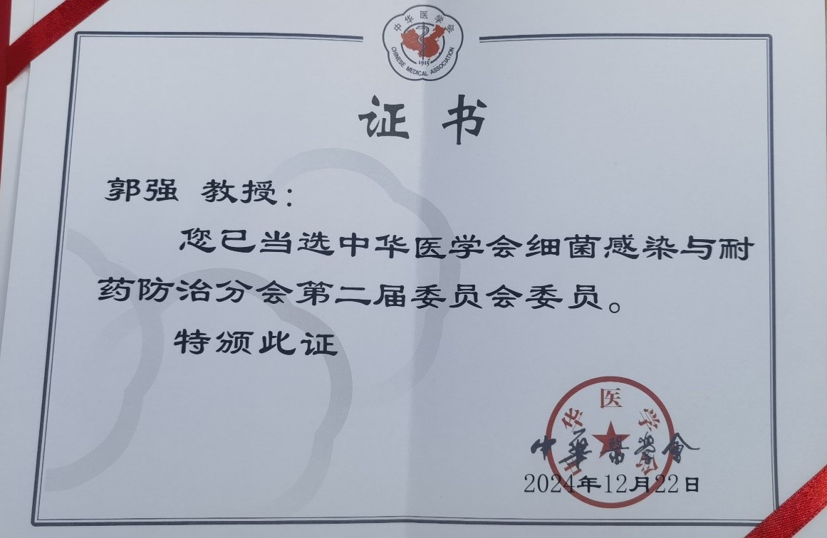2024年12月,中华医学会细菌感染与耐药防治分会第二届委员会名单公布,苏州大学附属第四医院副院长郭强教授当选中华医学会细菌感染与耐药防治分会委员。